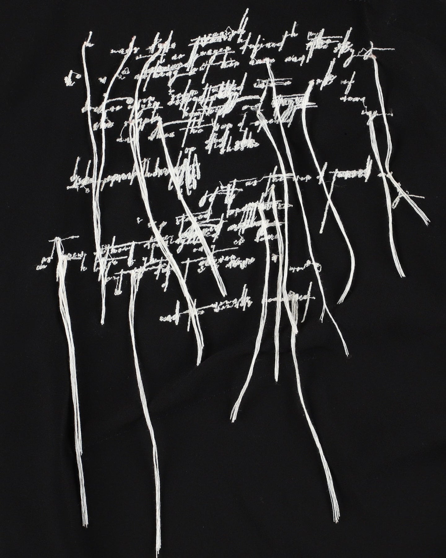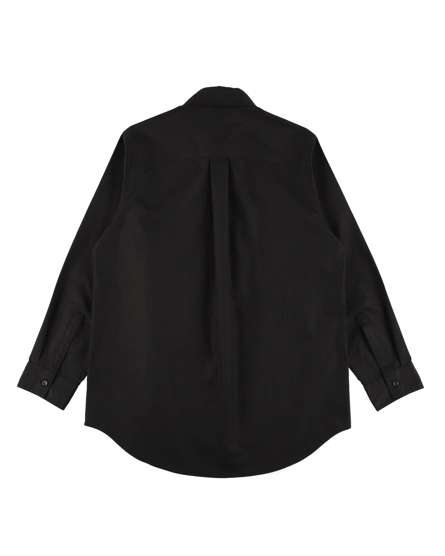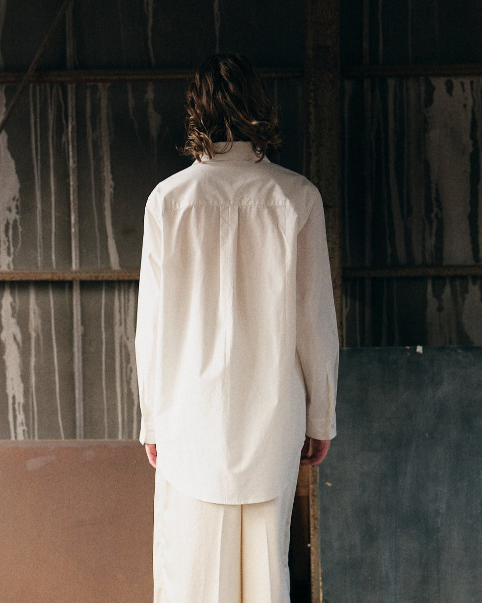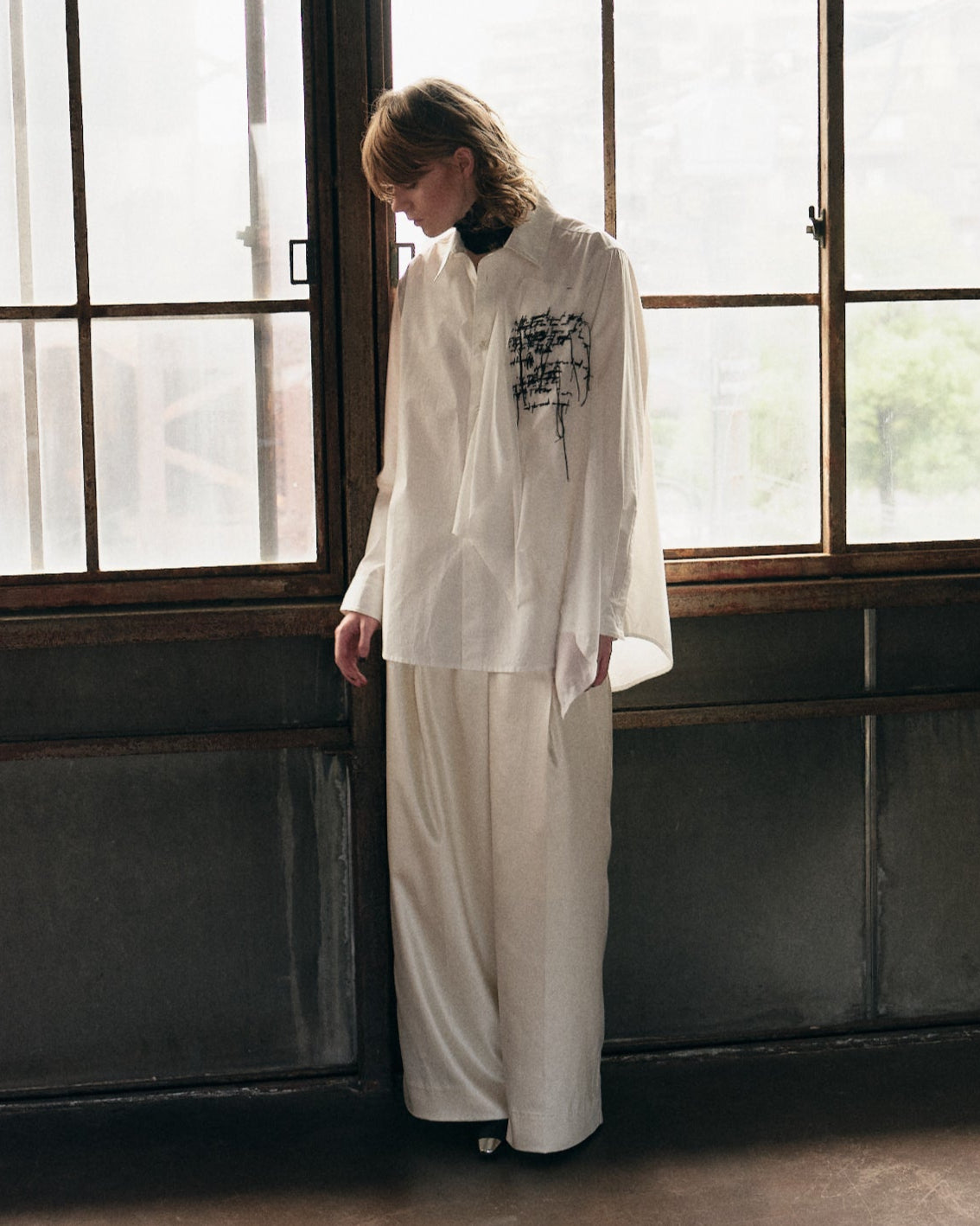 ・胸元に施された刺繍と、その上に重なるように配置したオーガンジー素材が特徴的なオーバーサイズシャツ。・刺繍の力強さと繊細な透け感のレイヤードが、独自の立体感と奥行きを演出。・ゆったりとしたシルエットながらも、軽やかな素材使いでエレガントさを兼ね備えたデザイン。・フリーサイズ仕様で男女問わず着用可能。・首元にはブランドシグニチャーのチョーカーベルトを合わせることで、よりモードな印象に。