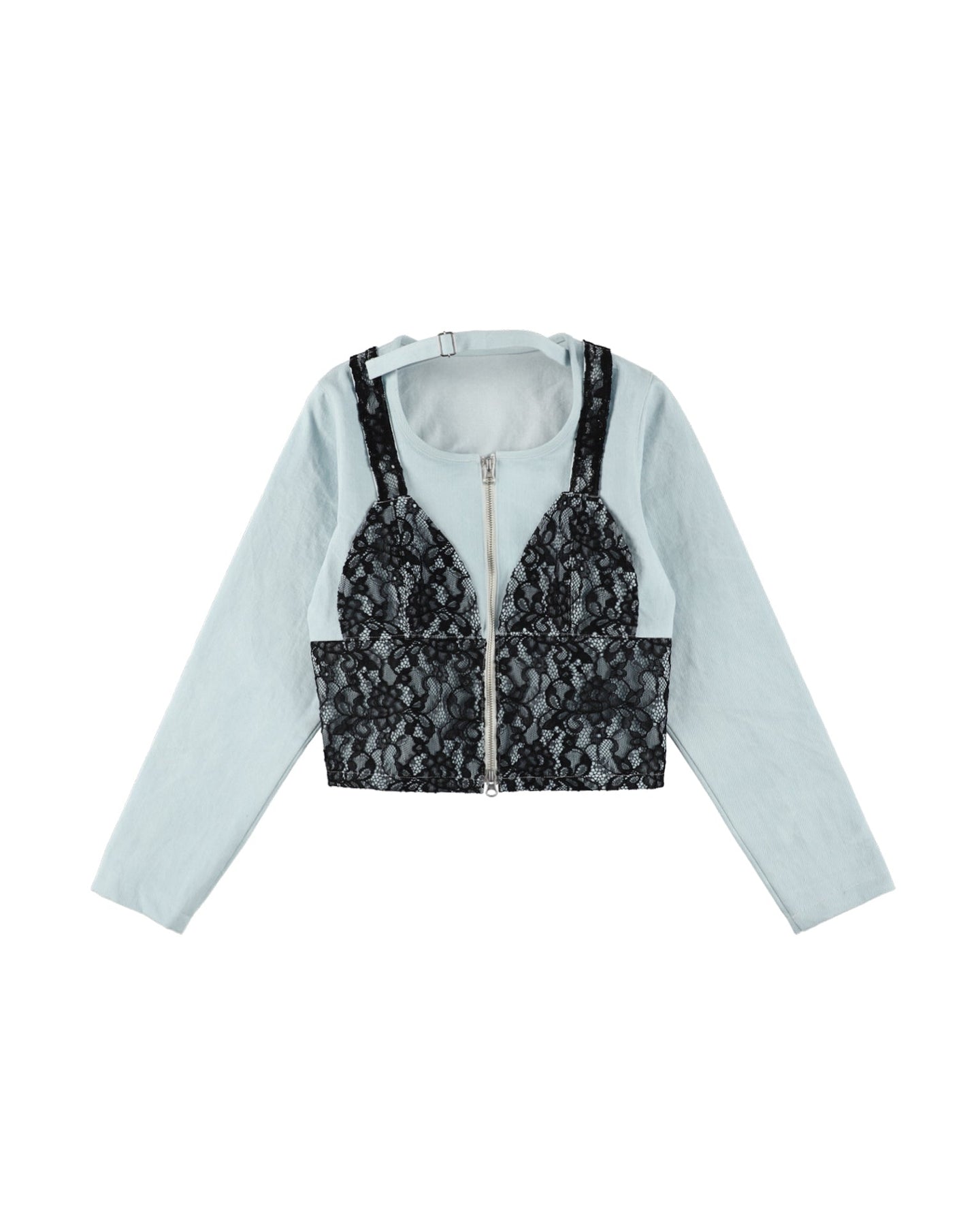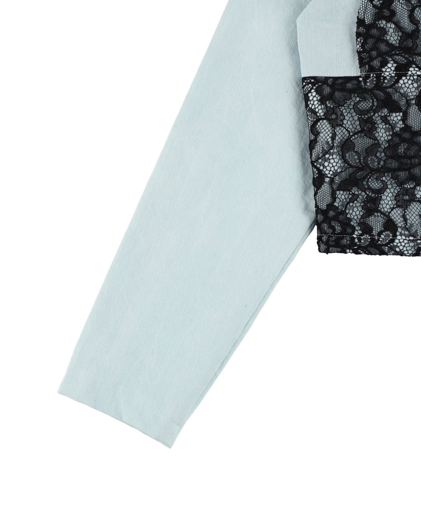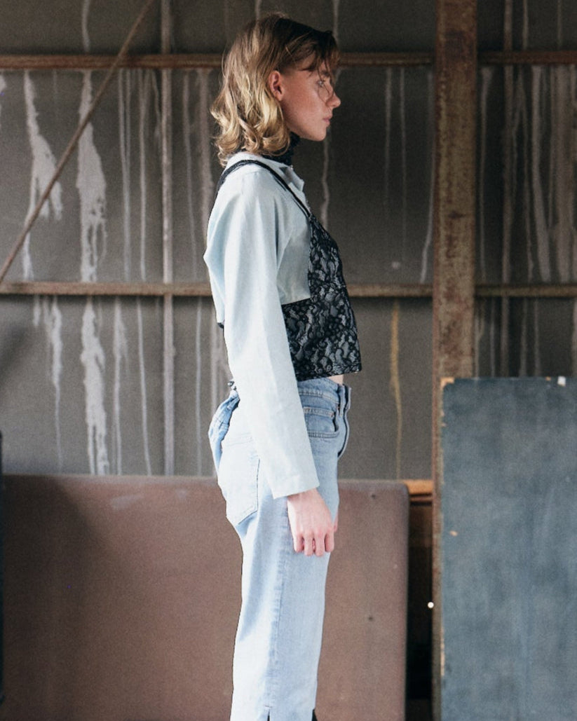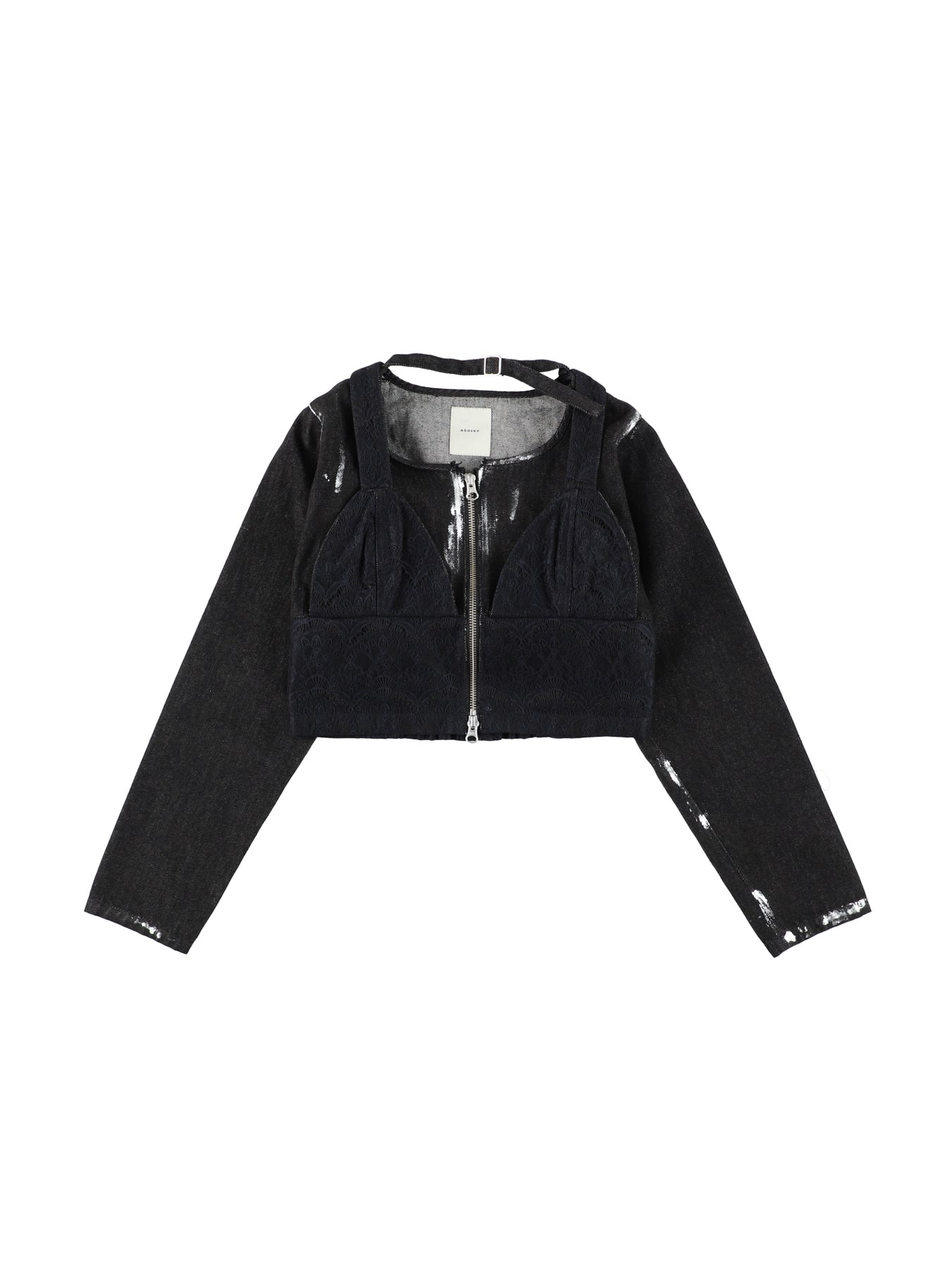 ・廃棄寸前のデニムを再構築したアップサイクルシリーズのトップス。・ライトブルーデニムのロングスリーブに、ブラックレースのキャミソールを大胆にドッキング。・フロントはジップ仕様で、レースキャミをレイヤードしたような立体的な表情を演出。・背中にはバックルディテールを配し、後ろ姿にもモードなアクセント。・ワーク感のあるデニムに繊細なレースを組み合わせることで、ハードとフェミニンが交錯する唯一無二のデザインに仕上げています。