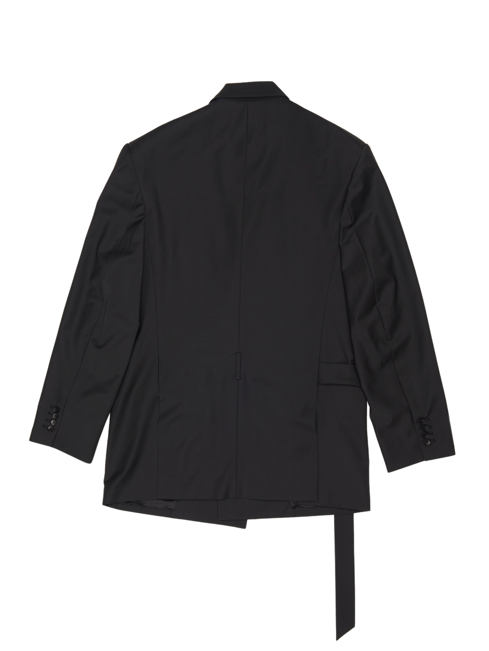 ・身幅とアームを通常よりもゆったりと取り、肩を落としてしっかりとした肩パッドを入れたオーバーサイズのボックスシルエットジャケット。・シャープで力強い印象を与えるピークドラペルを採用し、オーバーサイズの中にエッジを効かせたスタイリッシュなデザイン。・身頃脇にベルト留め具を施し、ウエストベルトを閉めることでシルエットを調整可能。目線を上に持ってくることで全身のバランスを整えた着こなしに。・首元のチョーカーベルトは留めても外しても着用できる2way仕様。・トルコのウールステッドメーカー「BAHARIYE(バハリエ)」社のこだわりの高級素材を使用。・軽くしなやかで上質な光沢感があり、ポリエステル・ウール混紡ながらもスーパー120の80番双糸を使用した平織2WAYストレッチ素材で快適な着心地。・同素材の GURKHA TEPADE PANTS や RIDERS DETAIL GURKHA SHORTPANTS とのセットアップスタイルもおすすめ。