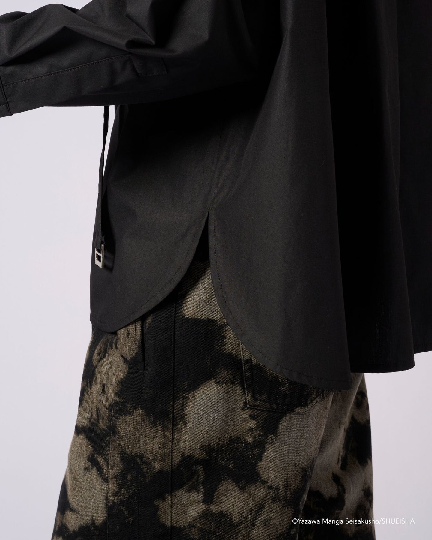 A bondage shirt with a tie, designed with Shin in mind. Shin has an edgy style that stands out even within the story. This model reinterprets that impression as a shirt that captivates with its structure.